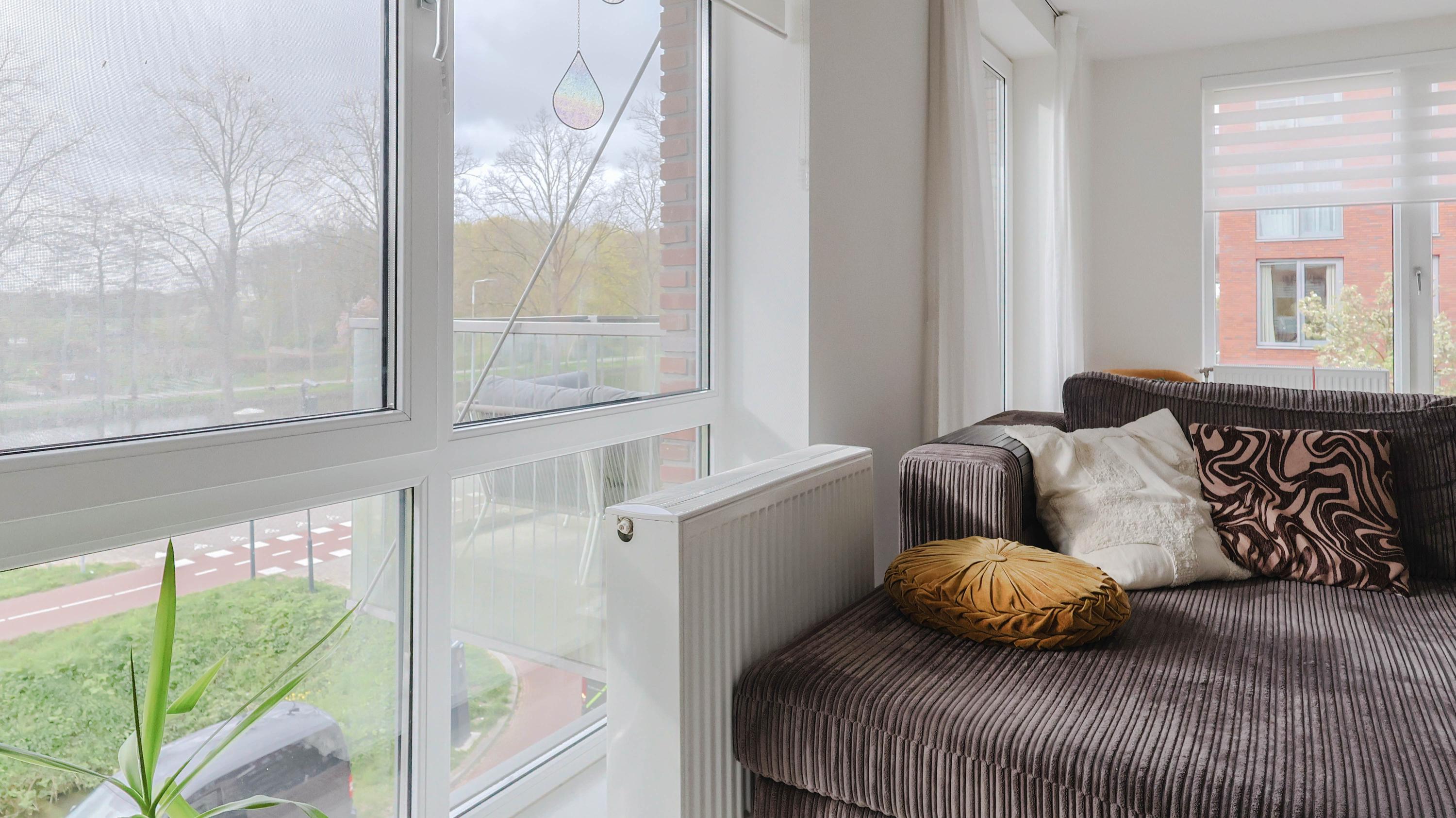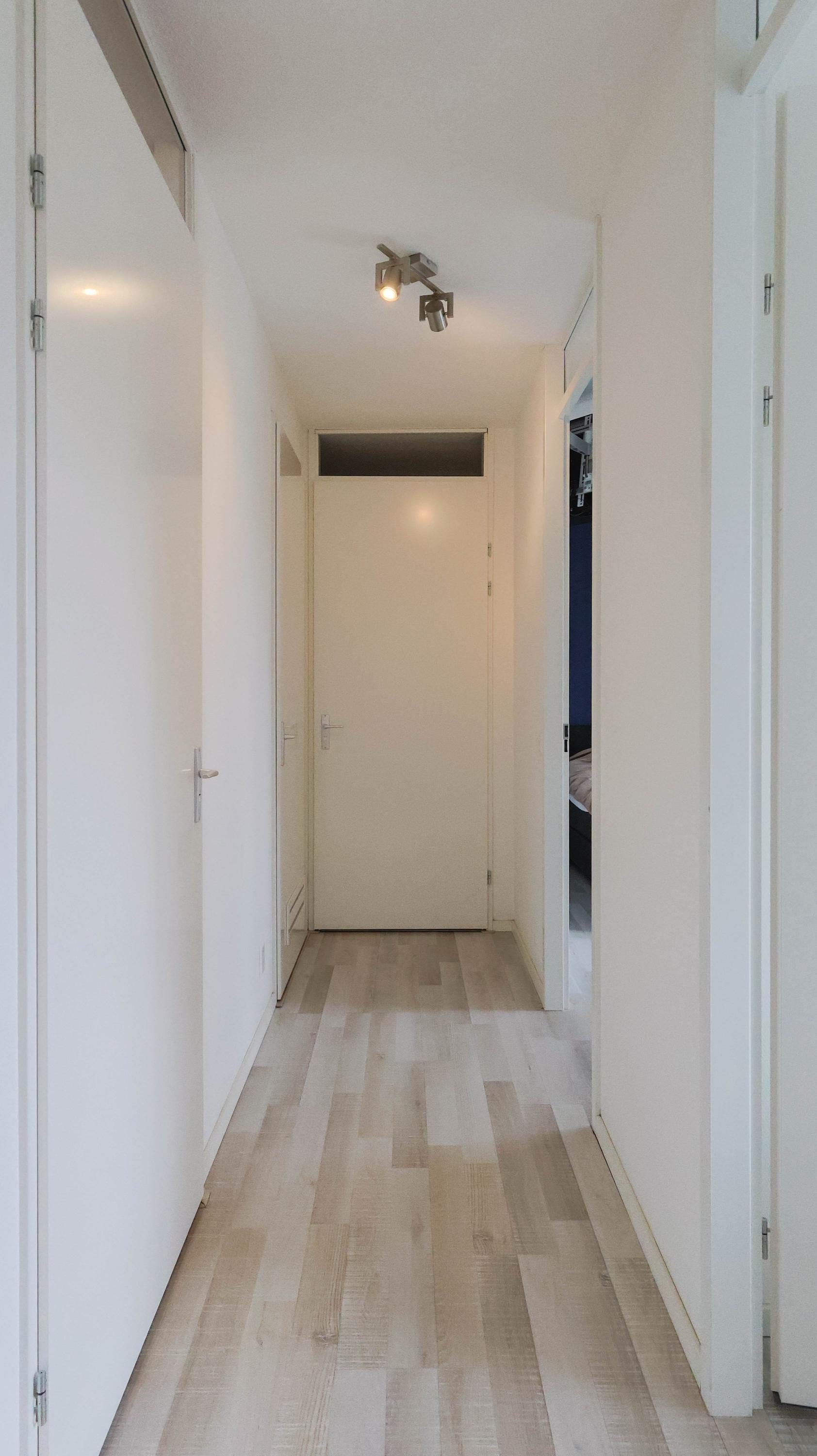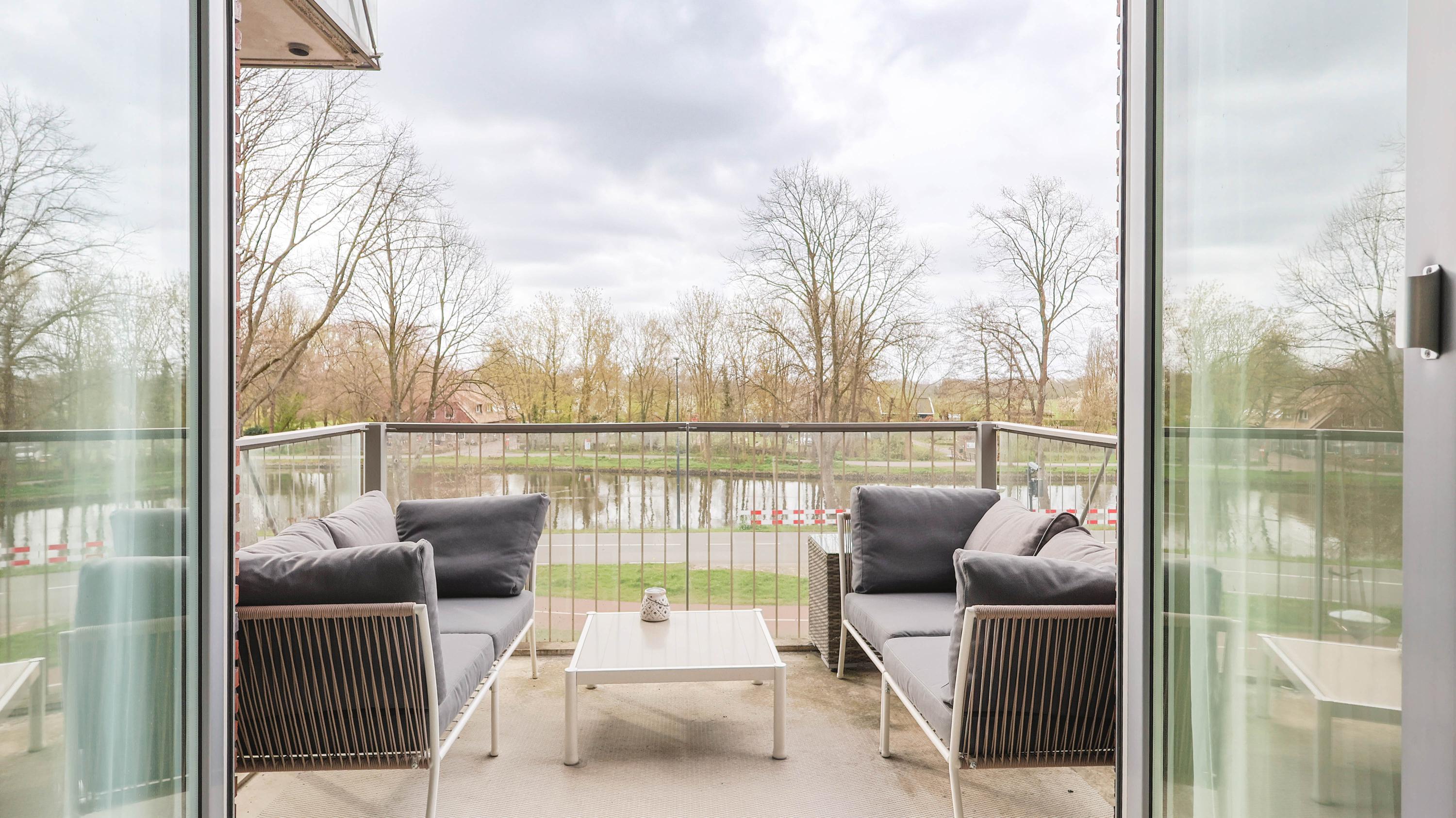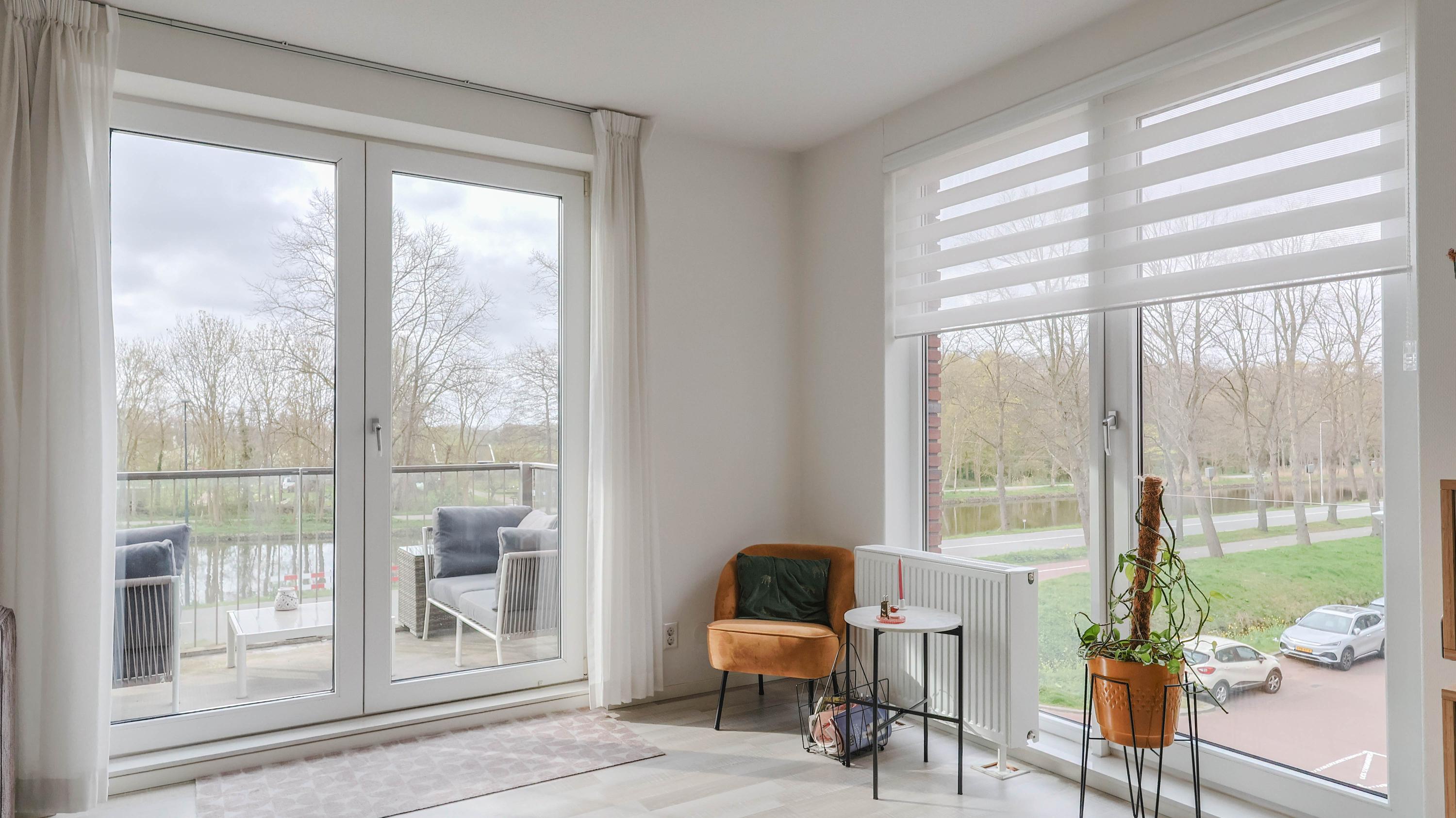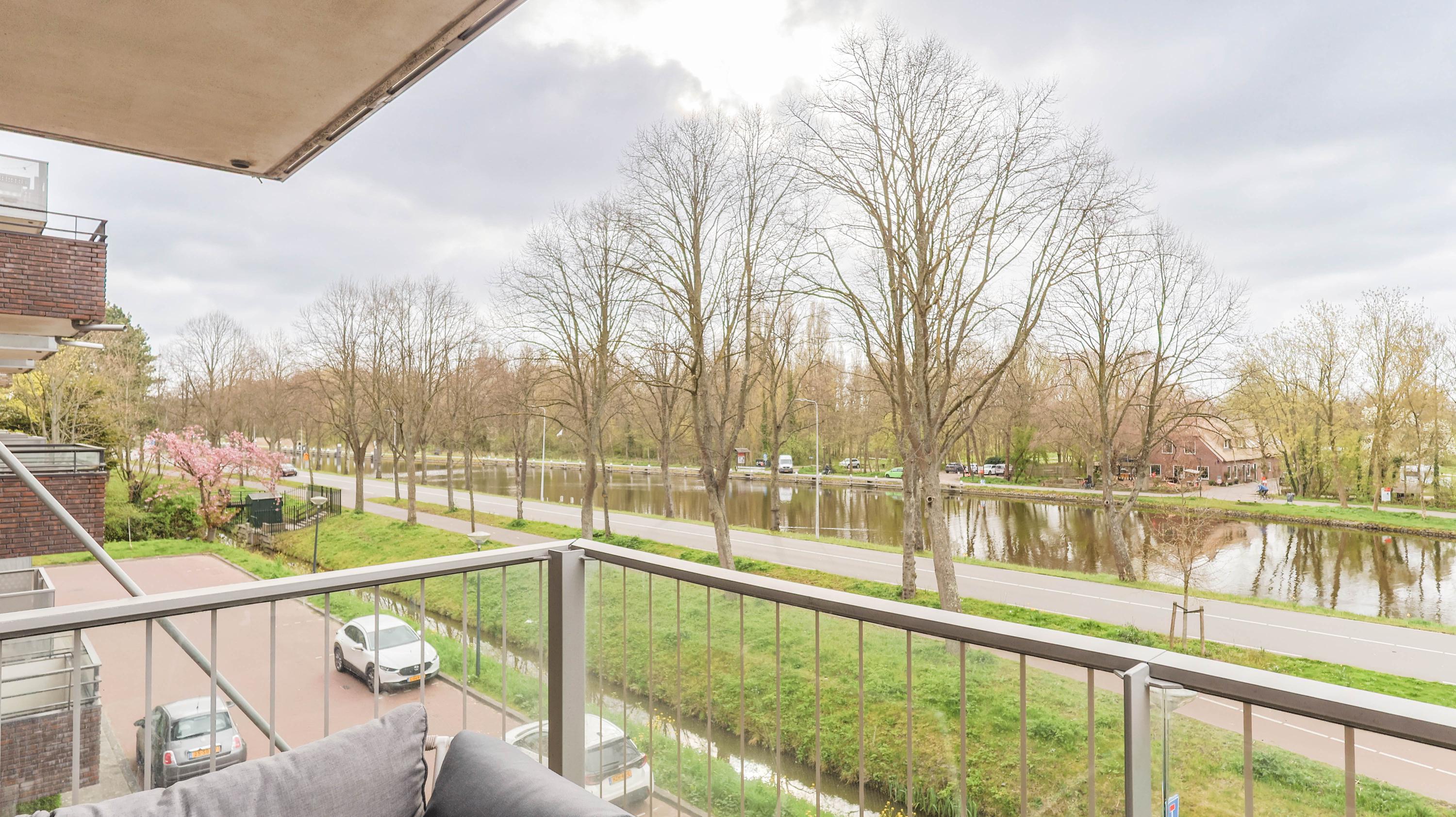 The living room is spacious and features an open kitchen equipped with an induction hob, extractor hood, oven, refrigerator, freezer, and dishwasher. From the living room, you can access the balcony, which offers a lovely view over the Rijn and Schiekanaal as well as Cronesteyn Park.