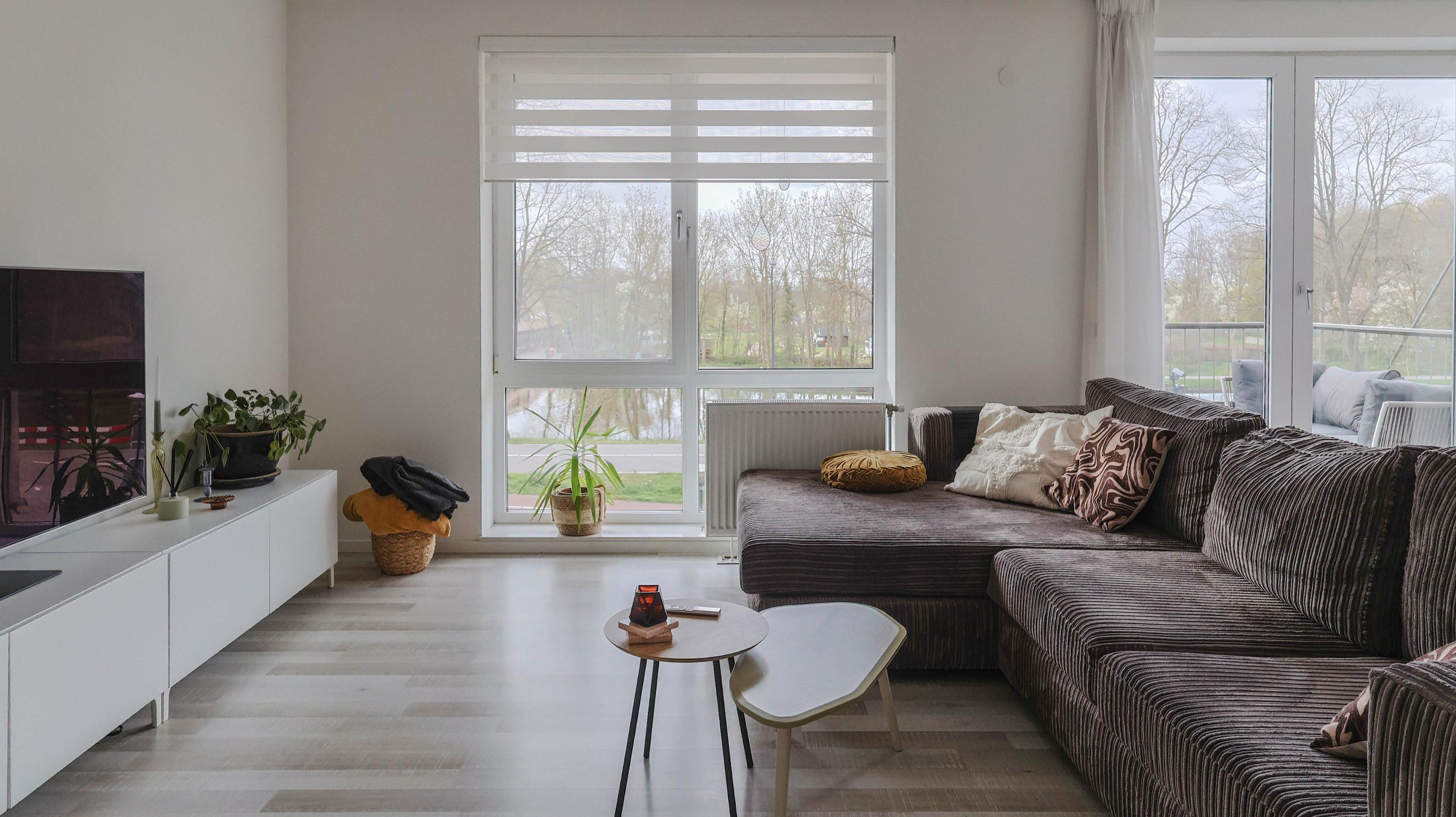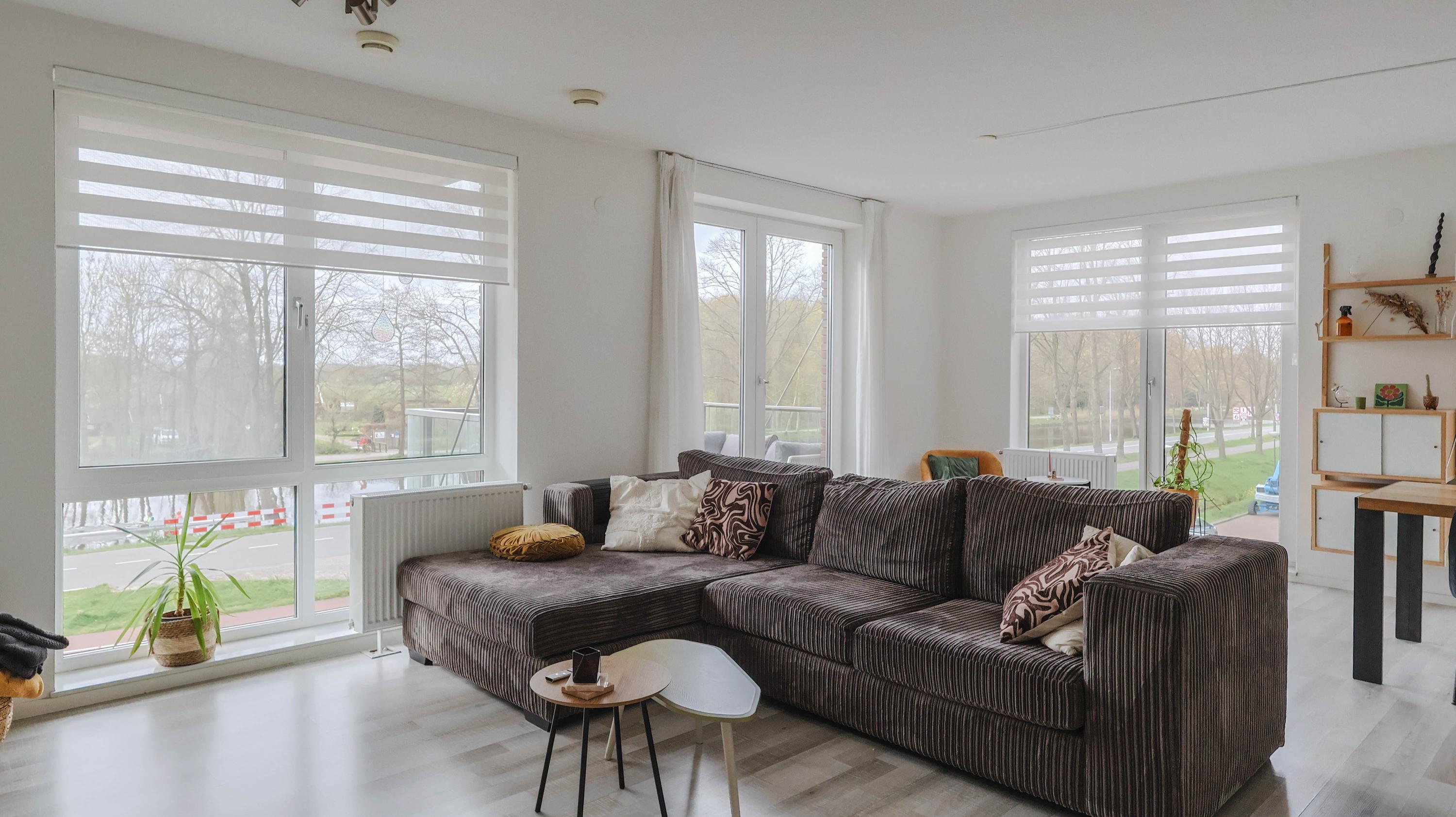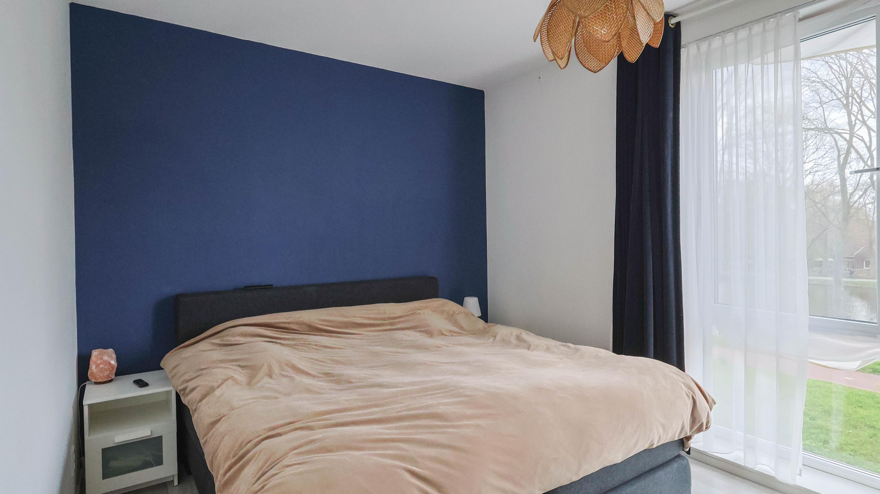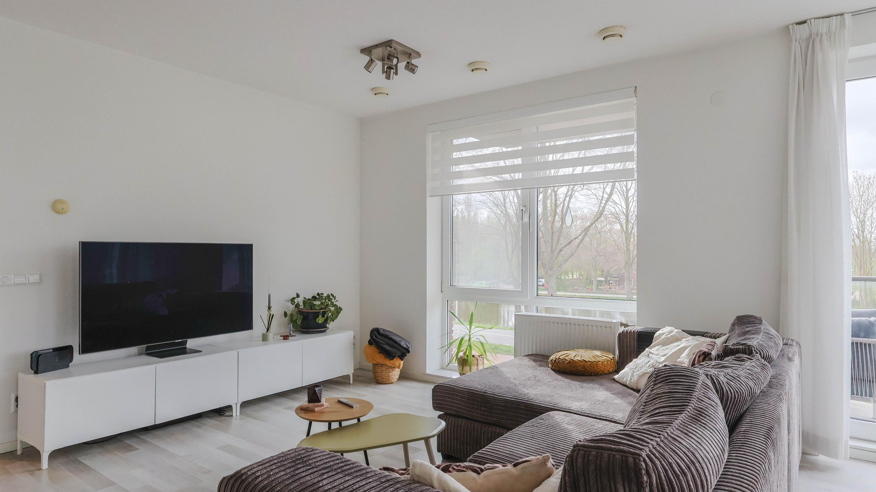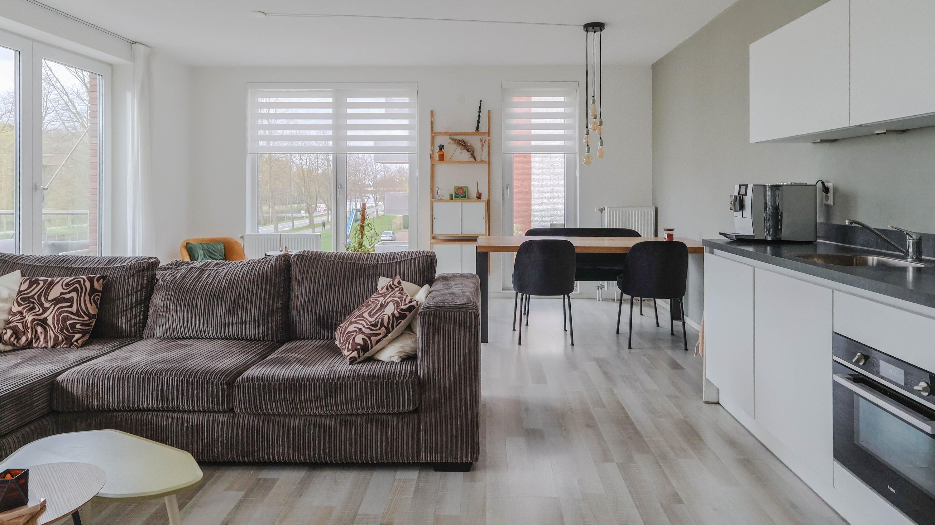 The living room is spacious and features an open kitchen equipped with an induction hob, extractor hood, oven, refrigerator, freezer, and dishwasher. From the living room, you can access the balcony, which offers a lovely view over the Rijn and Schiekanaal as well as Cronesteyn Park.