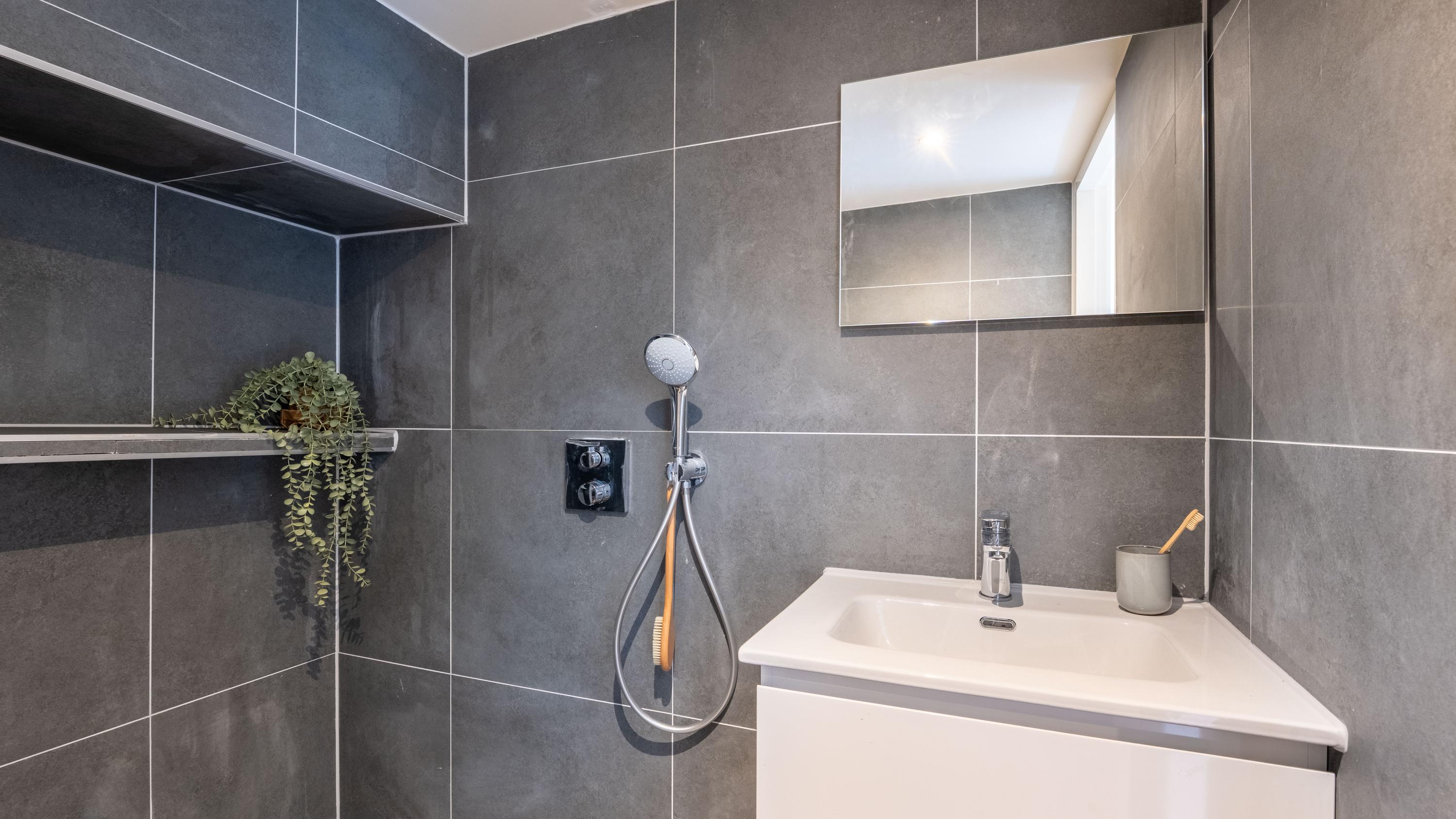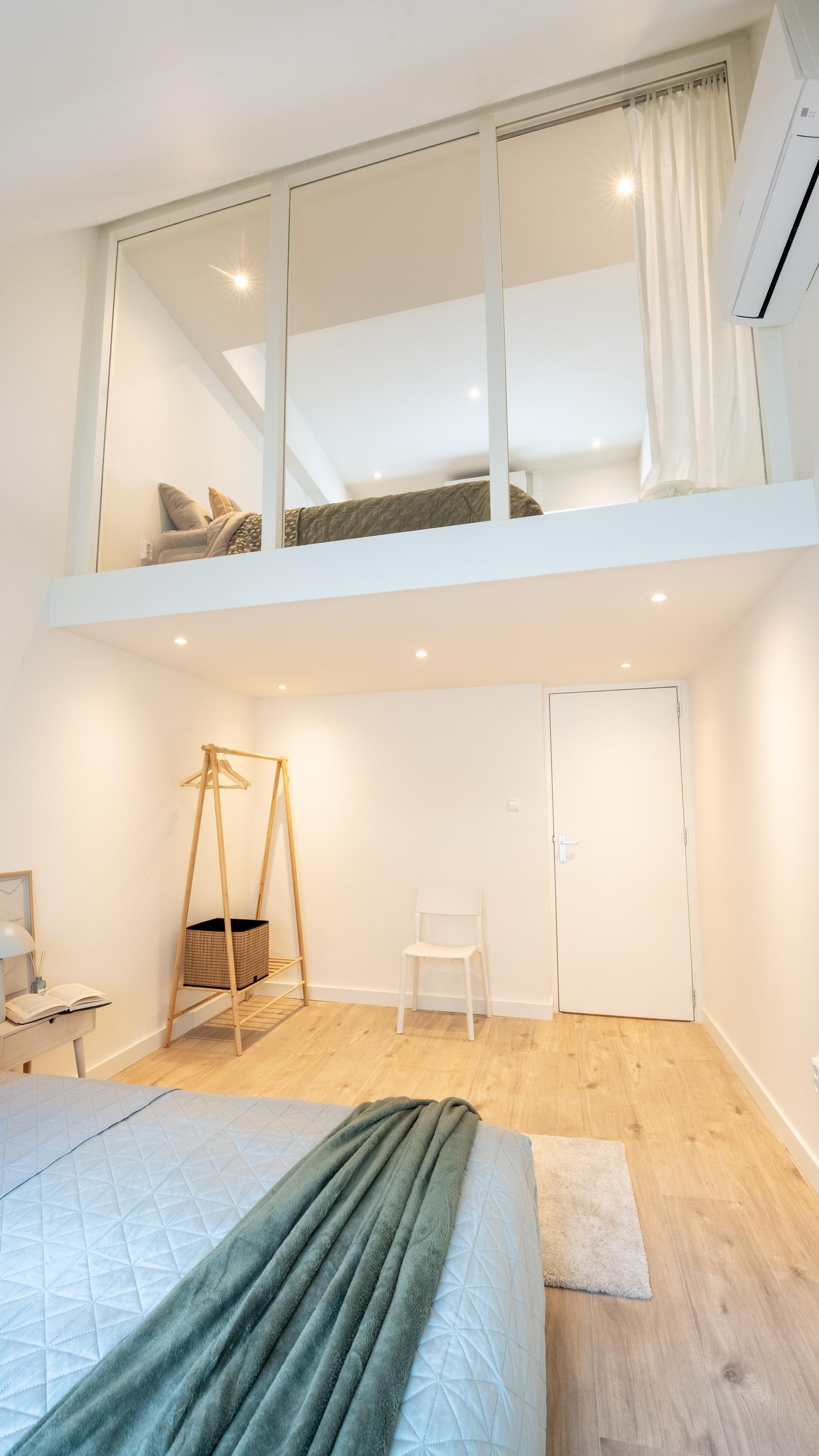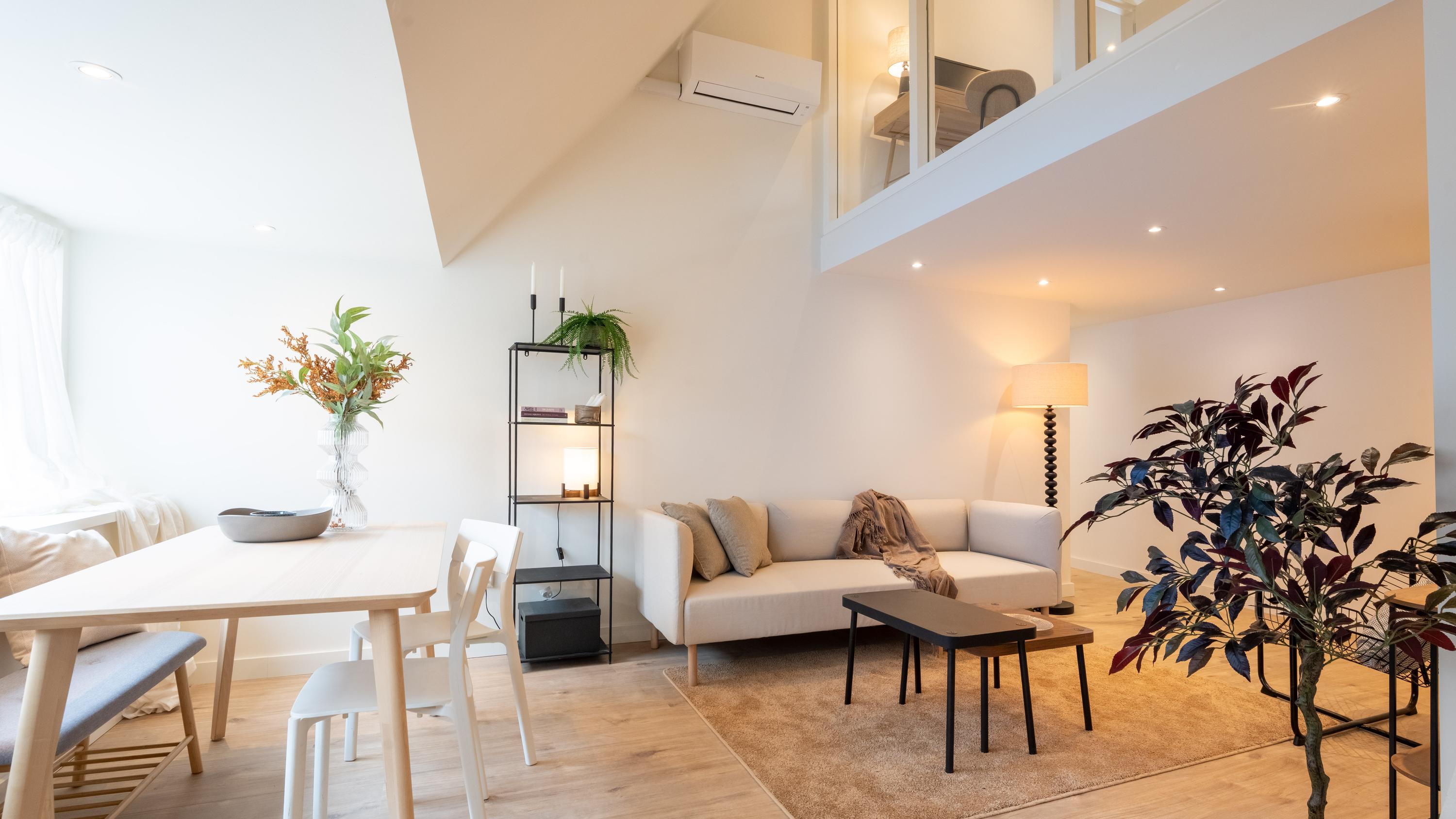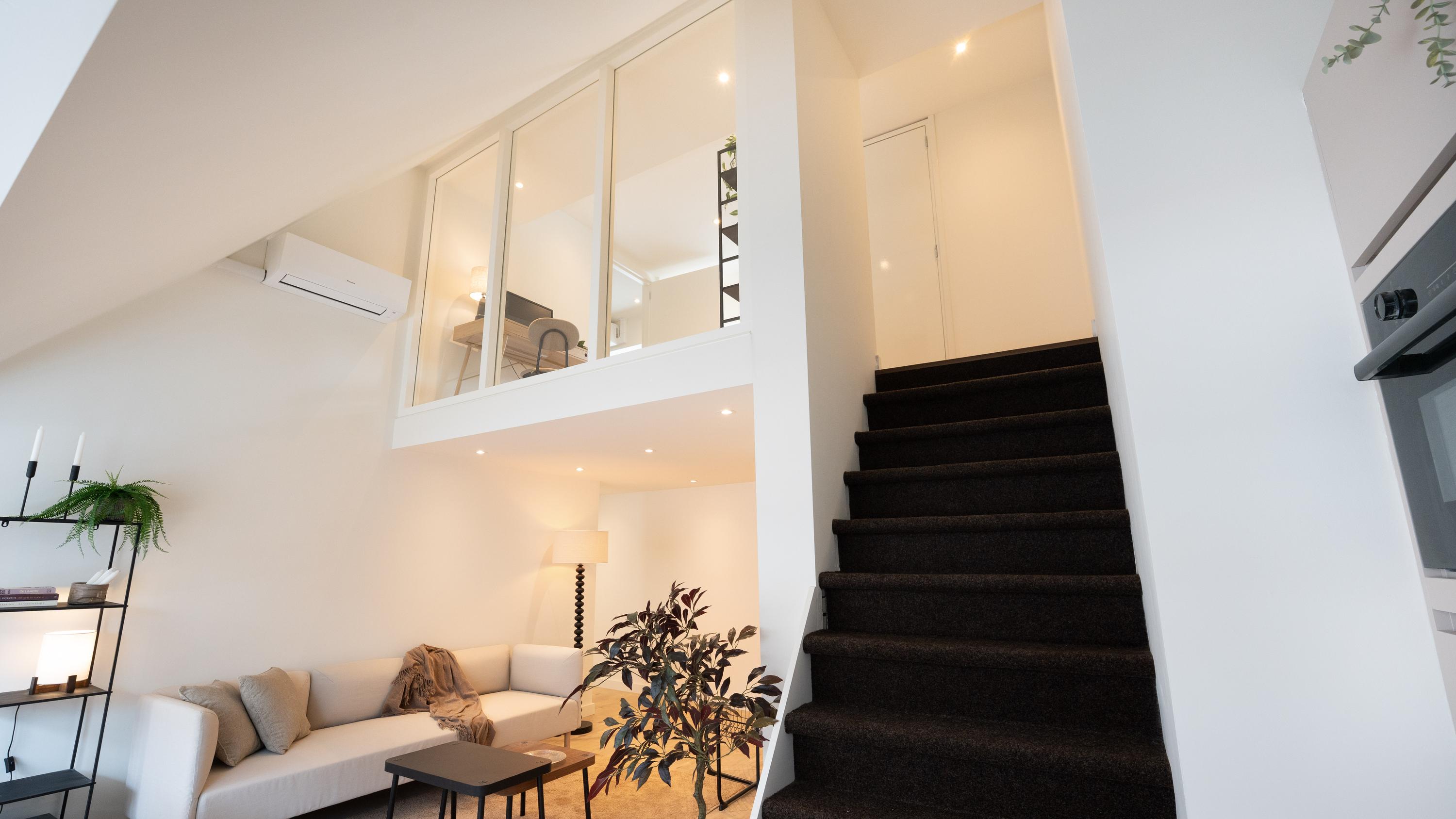 Situated on the first and second floors of a fully renovated small-scale complex, the front door to this delightful, brand-new apartment is accessible via the shared entrance. The living room features a modern and fully equipped kitchen and a separate cupboard for a washing machine. The hallway provides access to the separate toilet, the bathroom, and the spacious master bedroom. The fixed staircase in the living room leads to the spacious landing with more than enough room for a pleasant workspace and perhaps a reading nook. A second spacious bedroom is also located on this floor.