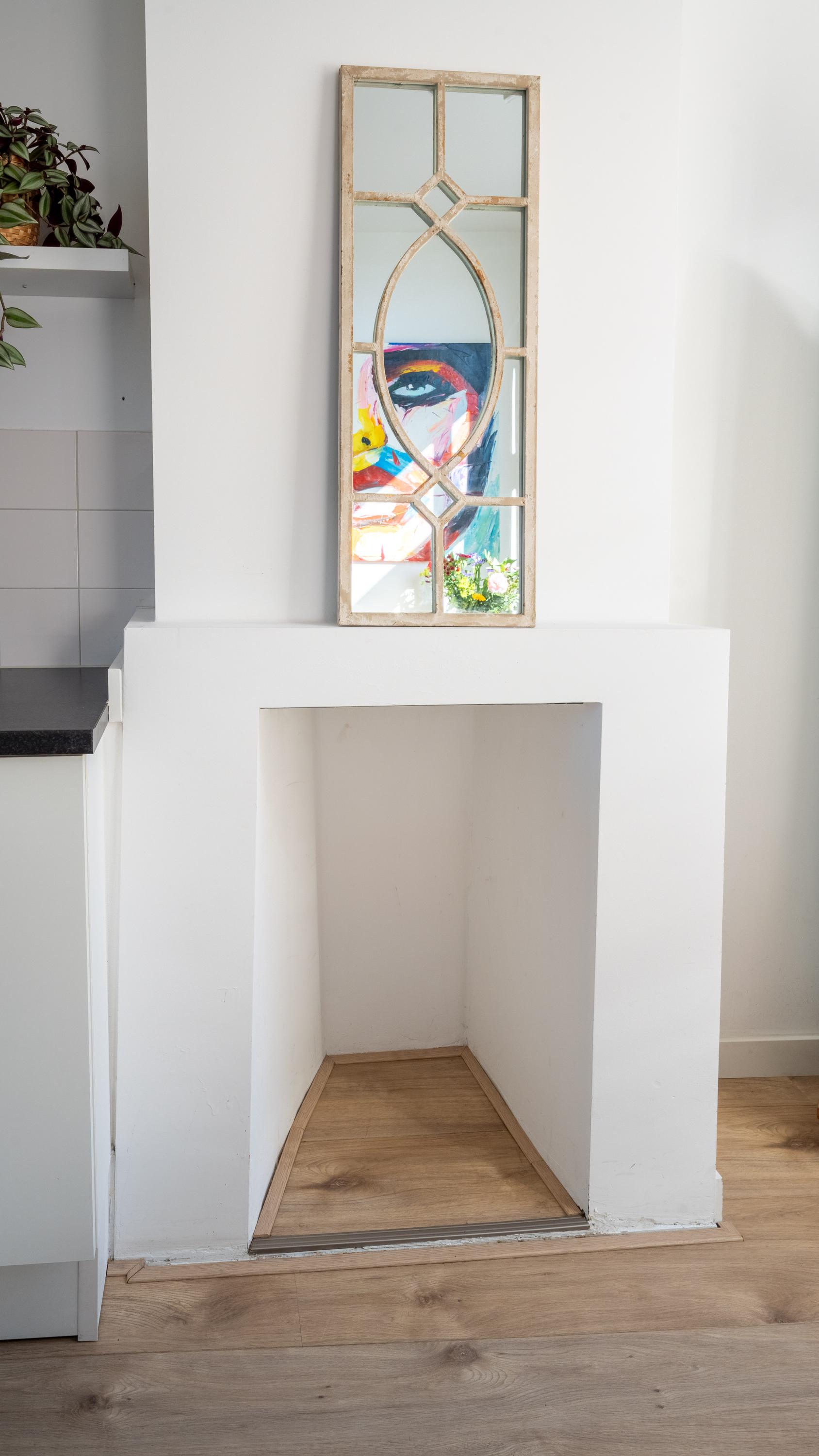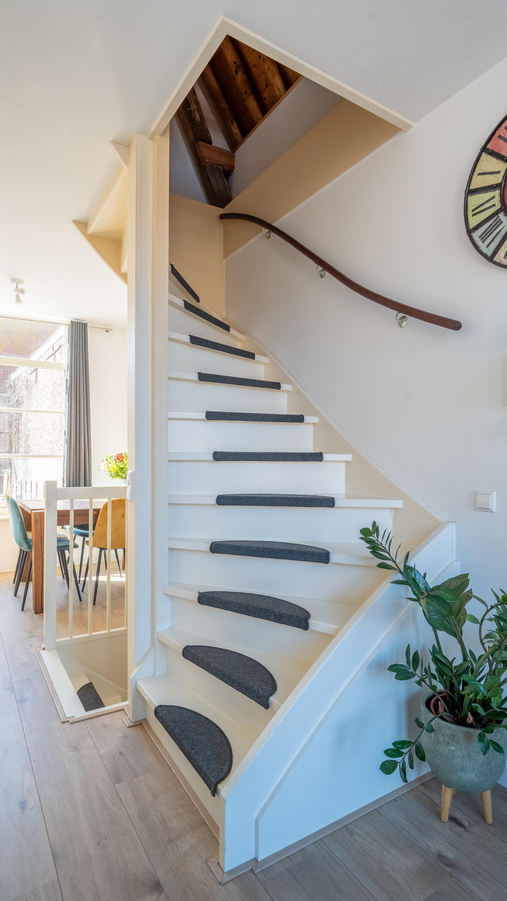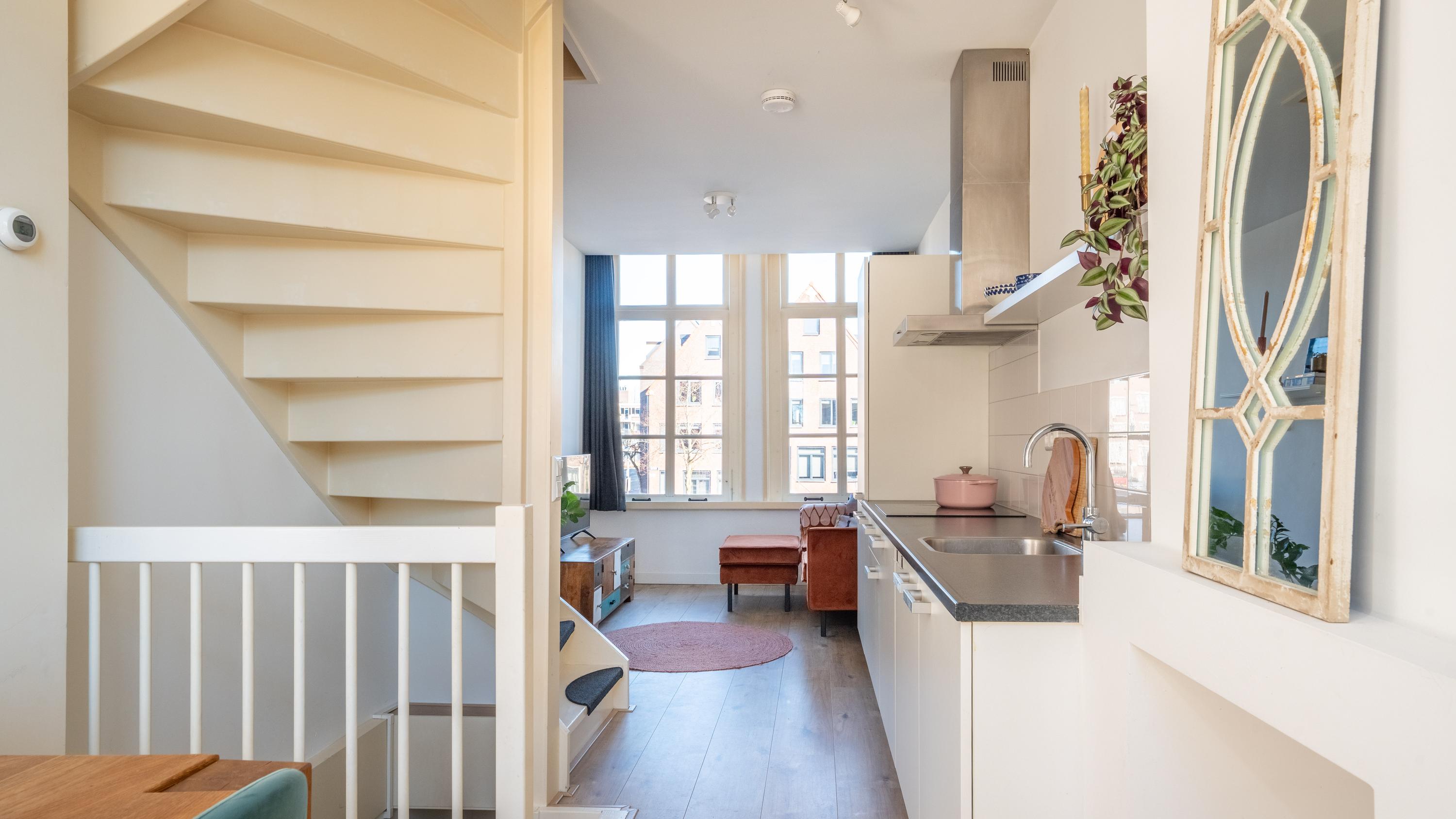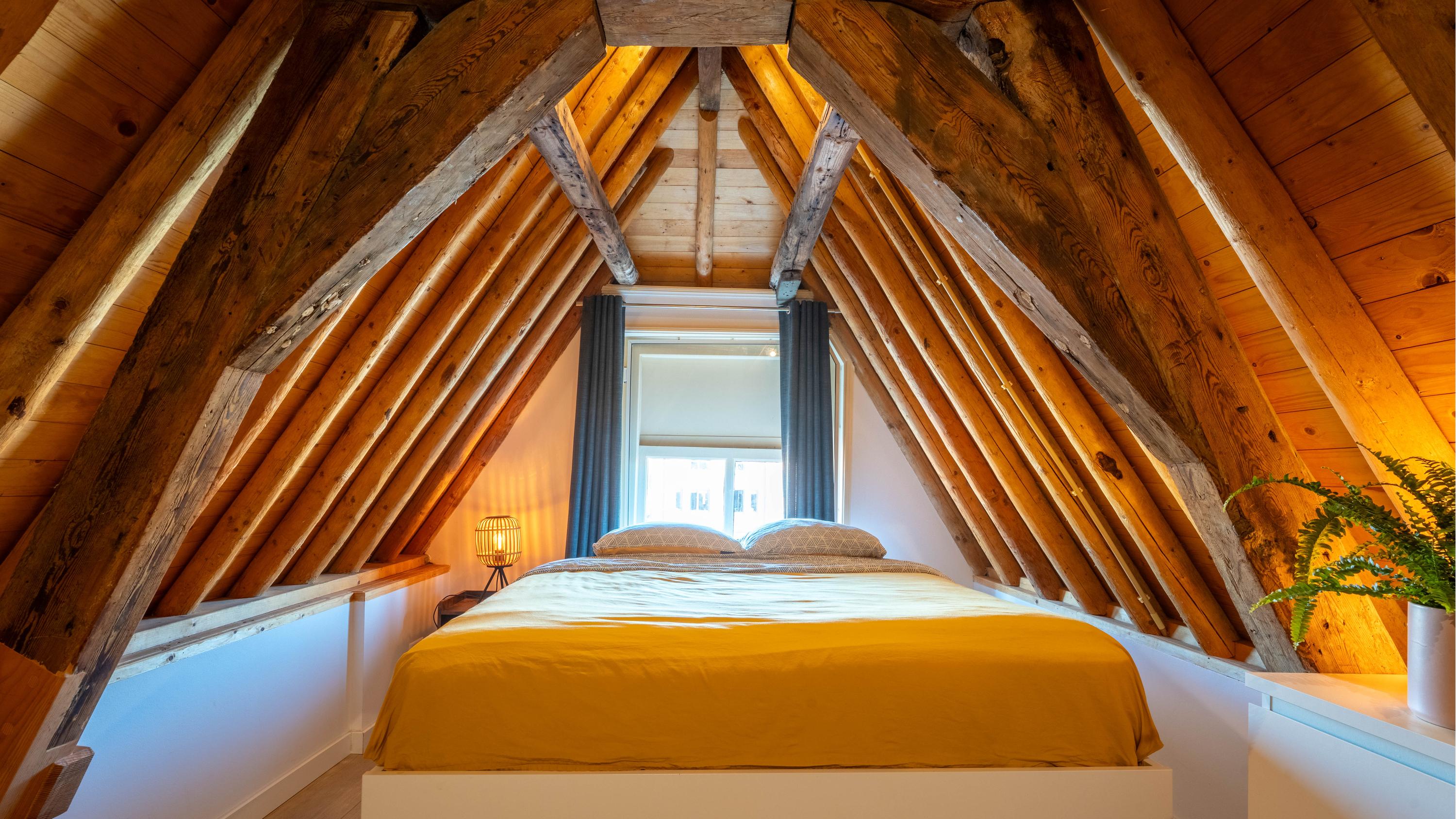 Met de vaste trap bereik je de tweede etage, waar direct de sfeer opvalt van de zichtbare kapconstructie. De slaapkamer is ondergebracht in deze romantische en karaktervolle verdieping, waar de fraaie houten balken een warme en unieke uitstraling geven. Ook de badkamer bevindt zich op deze etage en sluit qua sfeer mooi aan bij de rest van de woning. Deze is voorzien van een toilet, inloopdouche en wastafel. Het resultaat is een bijzonder sfeervol appartement waarin het moderne afwerkingsniveau niets afdoet aan het monumentale karakter.