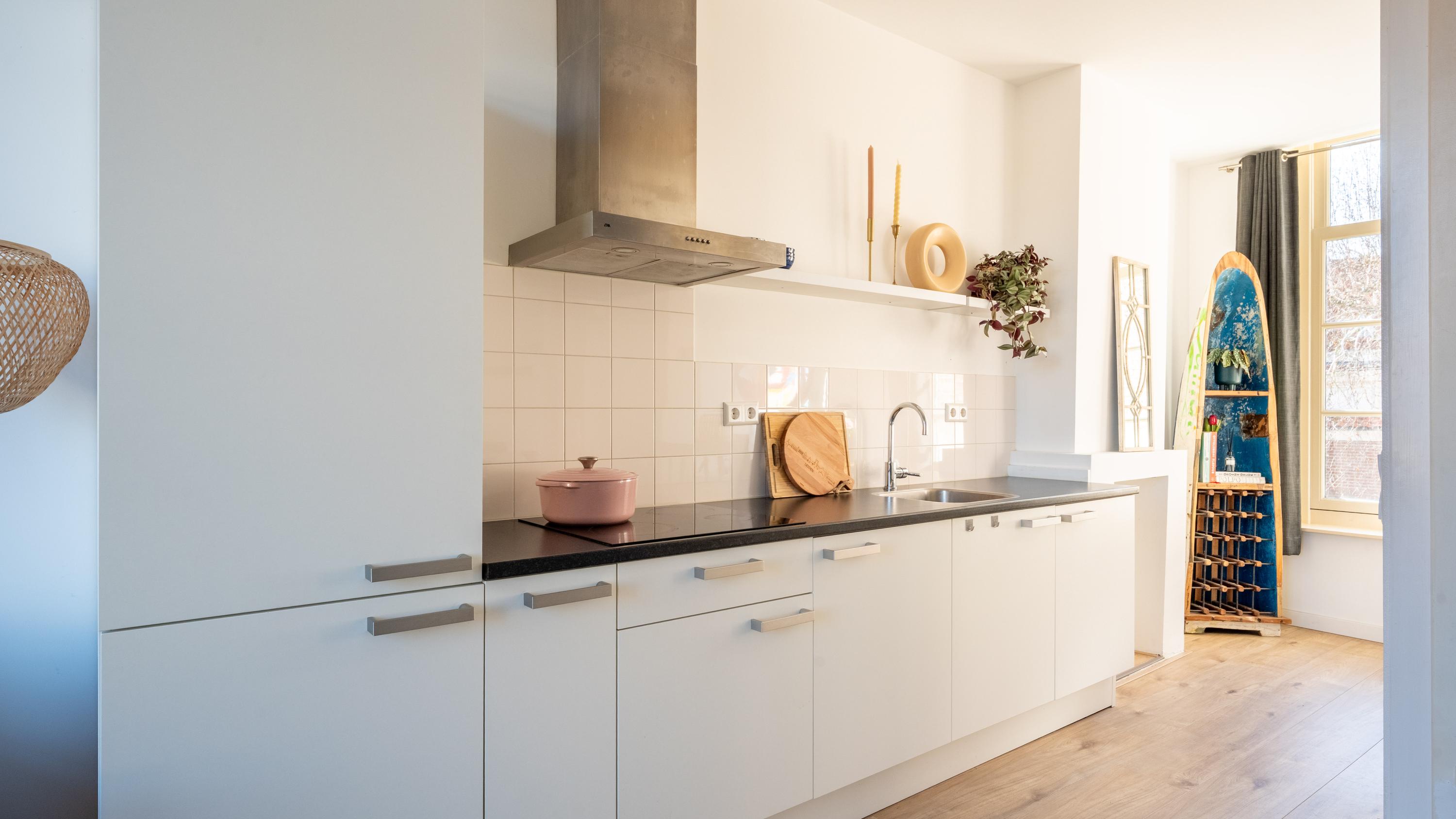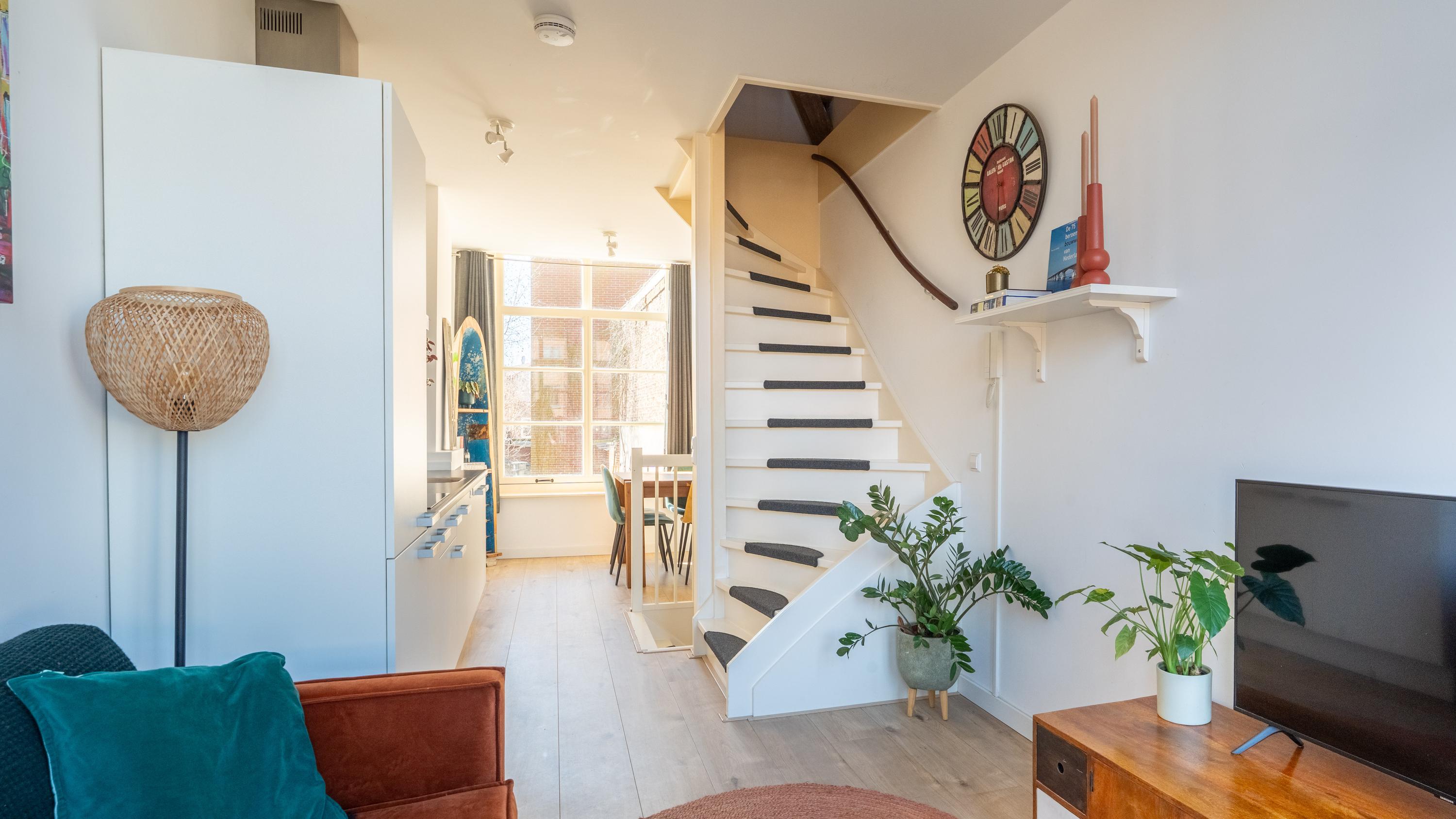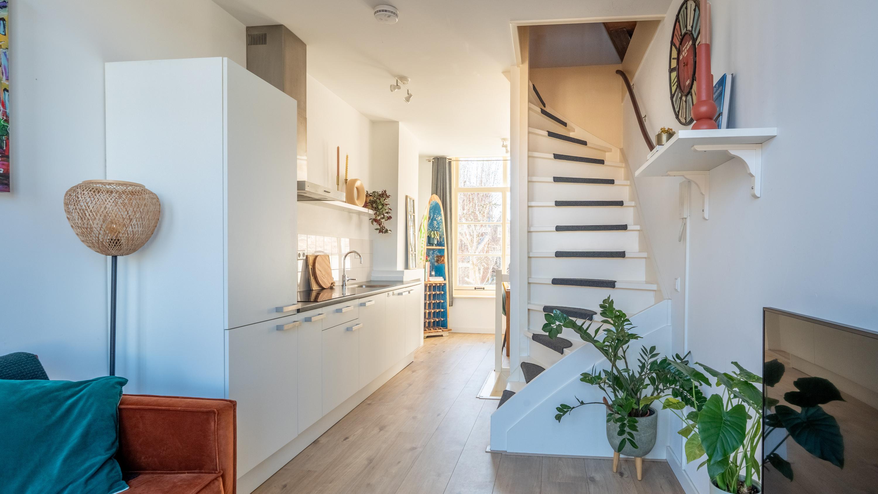 Via de gezamenlijke entree bereik je met de eigen trap de woonverdieping op de eerste etage. Deze woonlaag is bijzonder gezellig ingericht met aan de voorzijde het zitgedeelte, waar de grote ramen zorgen voor veel lichtinval en een prachtig uitzicht over de gracht. In het midden bevindt zich de moderne keuken, uitgevoerd in een rustige eigentijdse stijl en voorzien van alle wenselijke inbouwapparatuur. Aan de achterzijde is ruimte voor een fijne eethoek, waardoor de verdieping op natuurlijke wijze is ingedeeld in wonen, koken en tafelen.