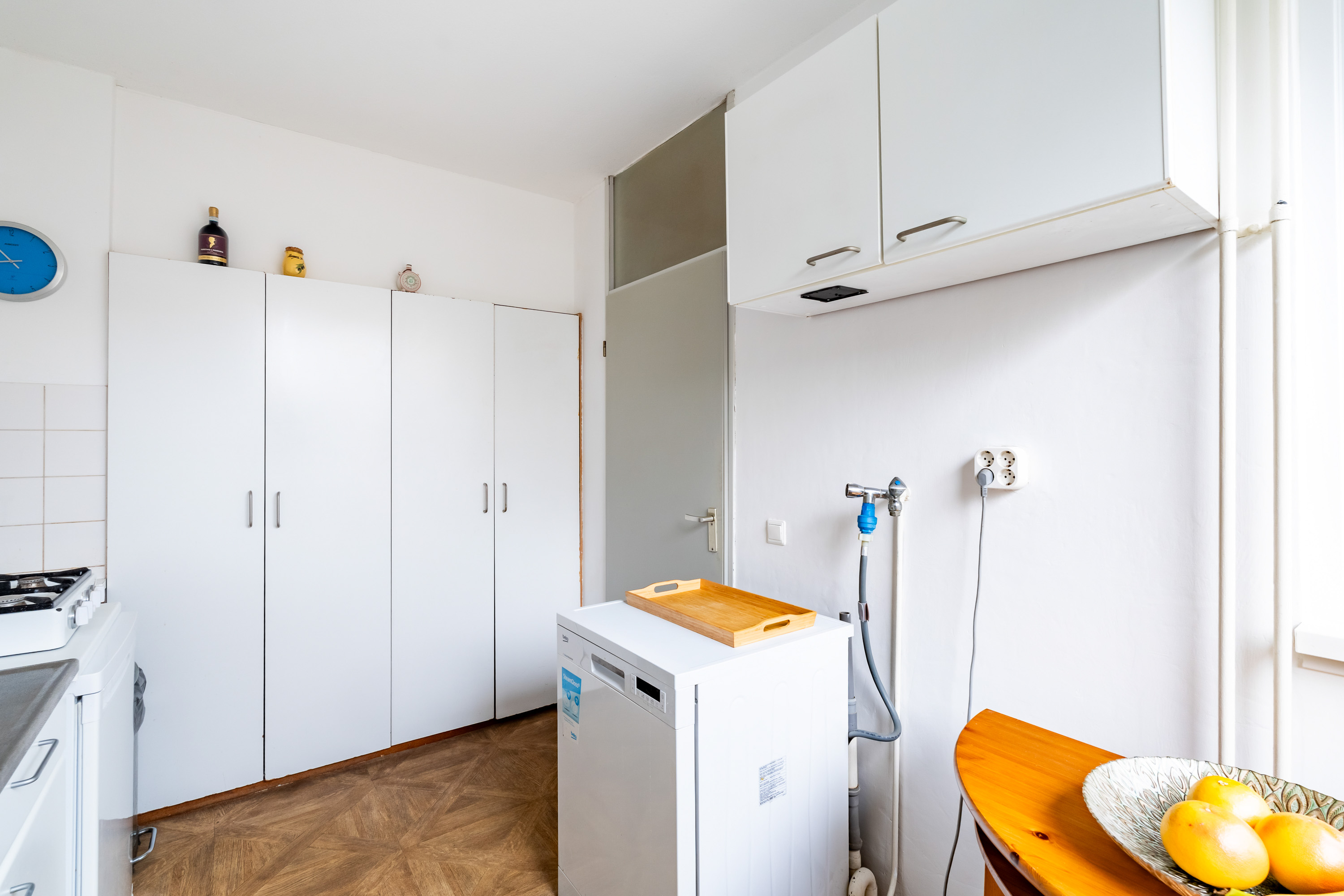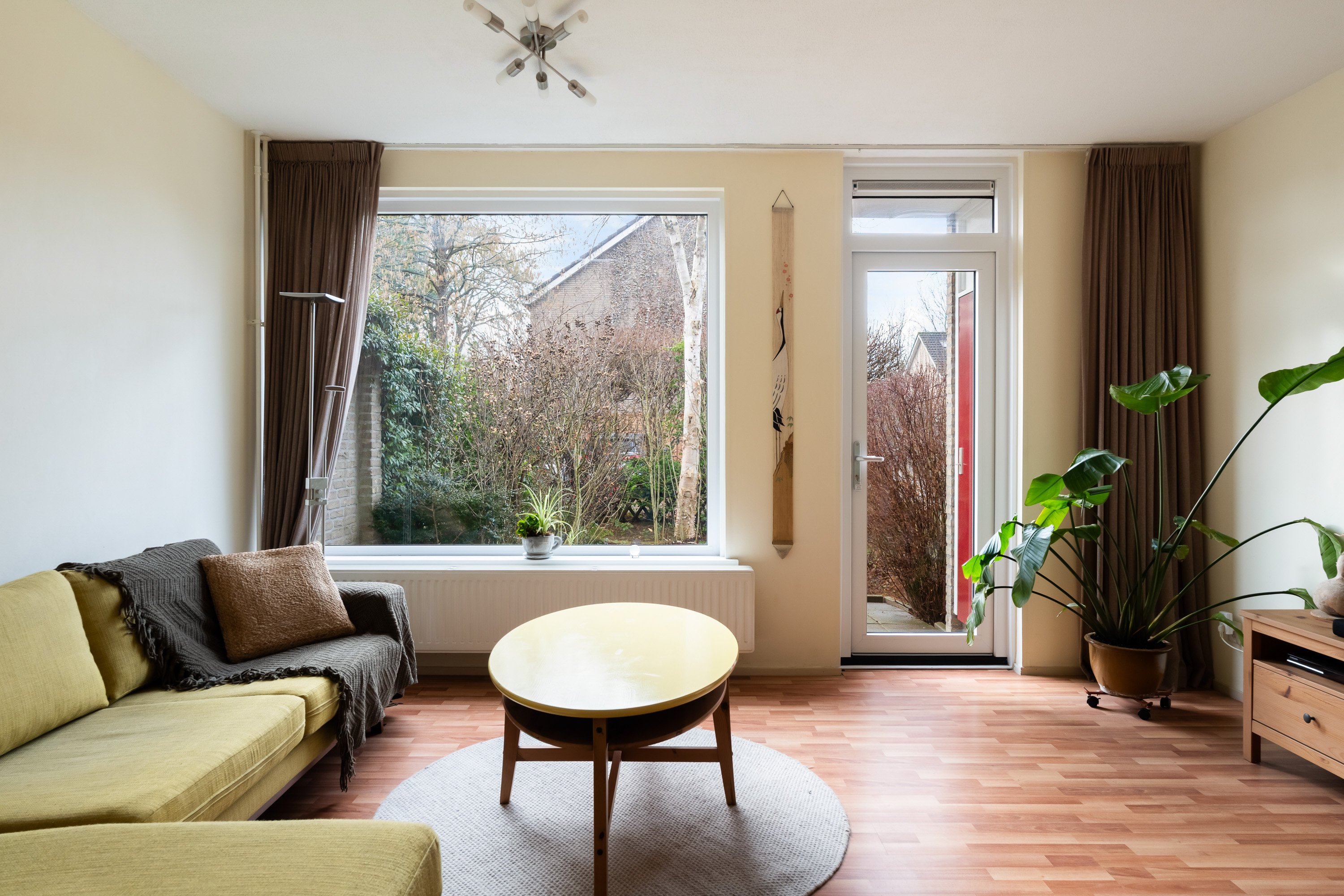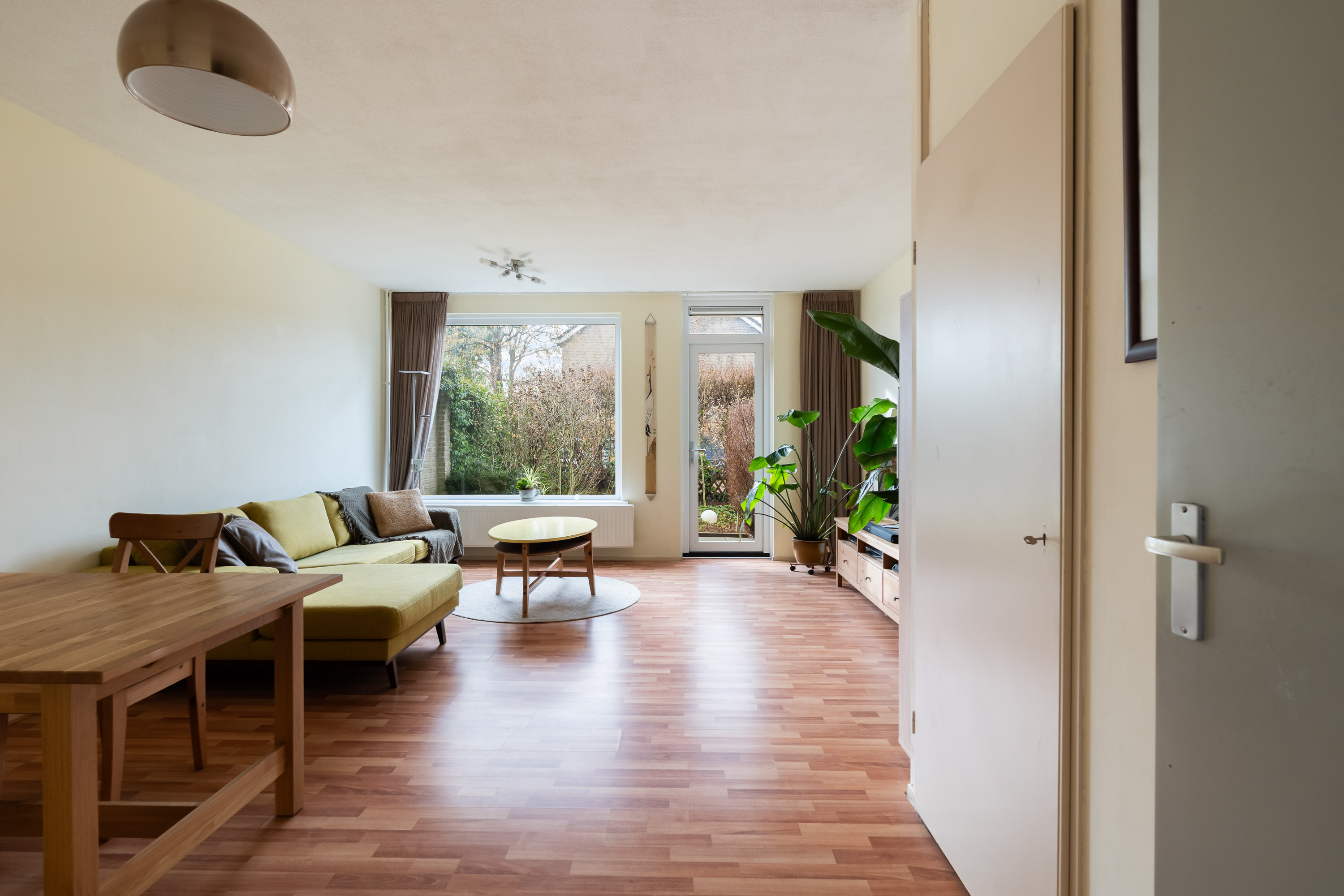 De lekker gelegen woonkamer is licht en geeft direct zicht op en toegang tot de groene en goed onderhouden achtertuin gelegen op het Zuidwesten. De vaste kast biedt ruimte voor opslag. De keuken is eenvoudig en separaat.