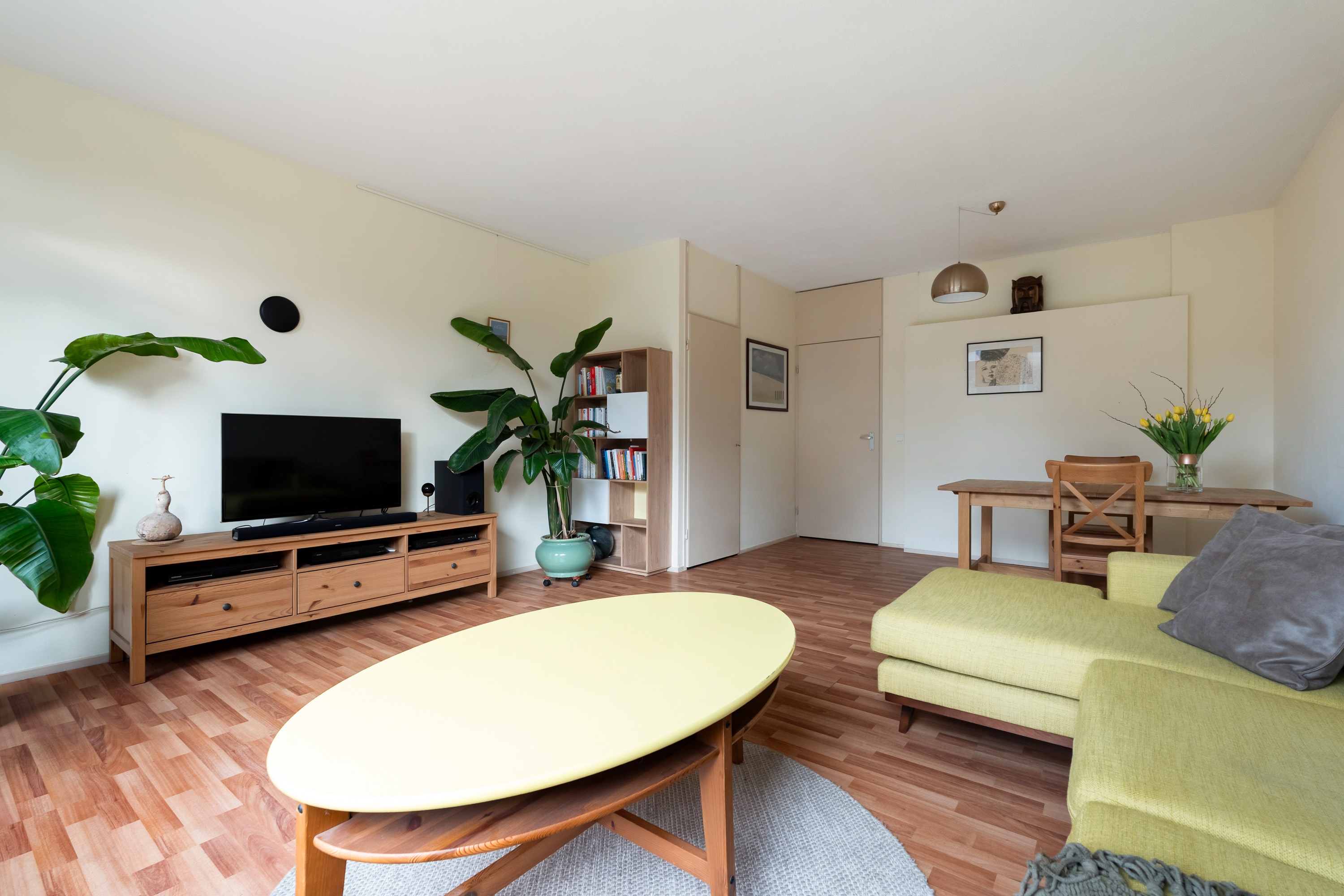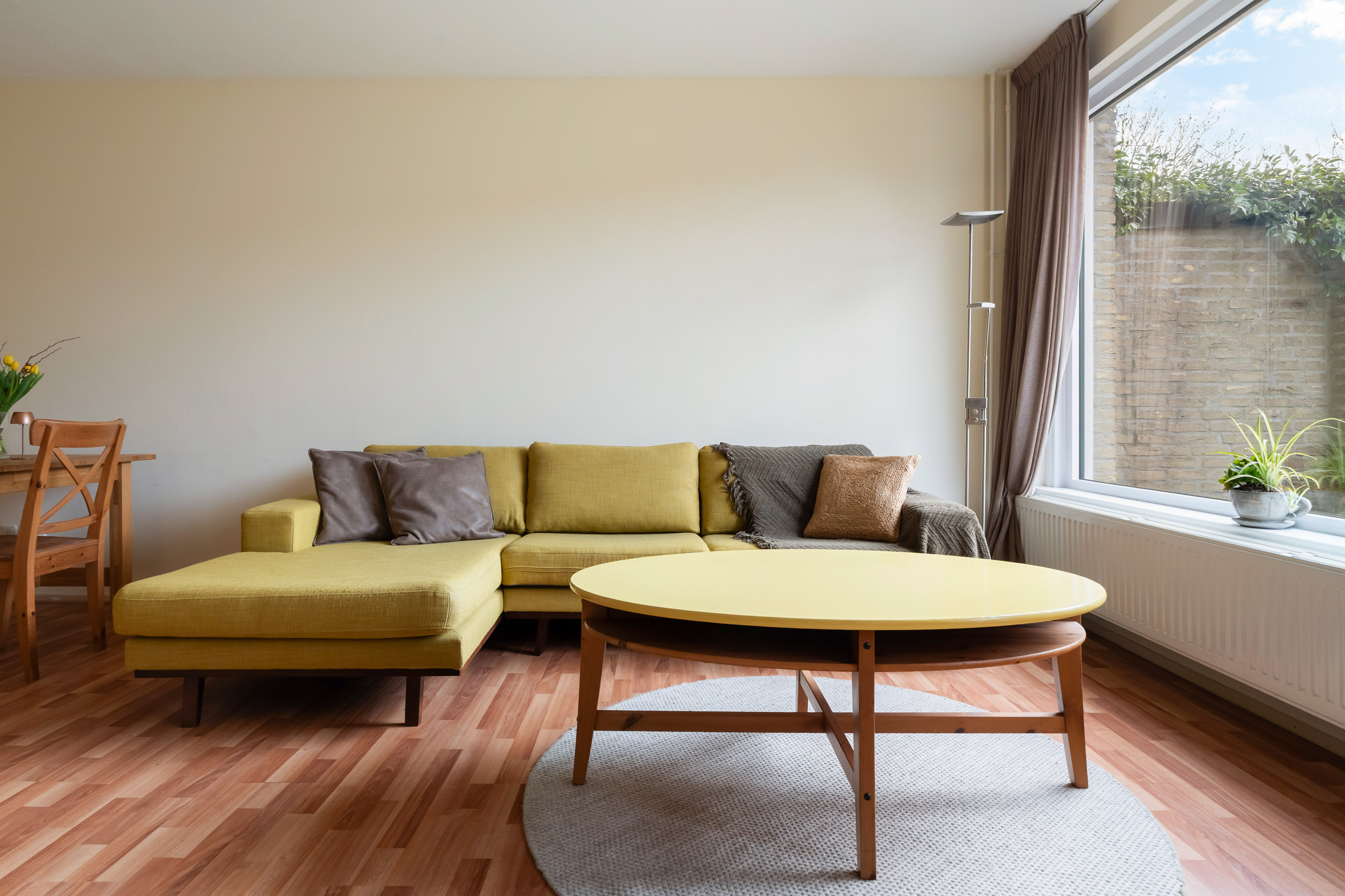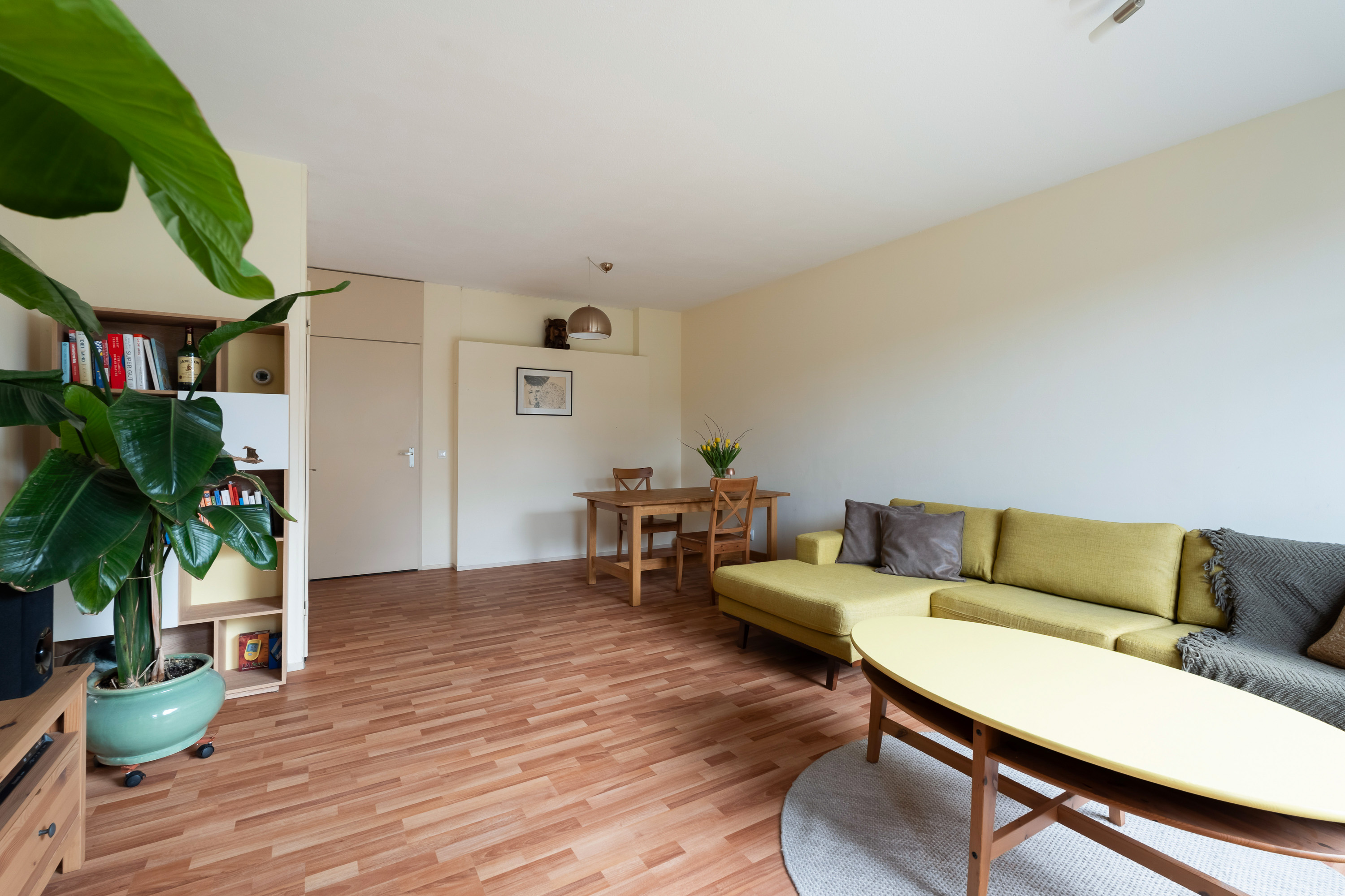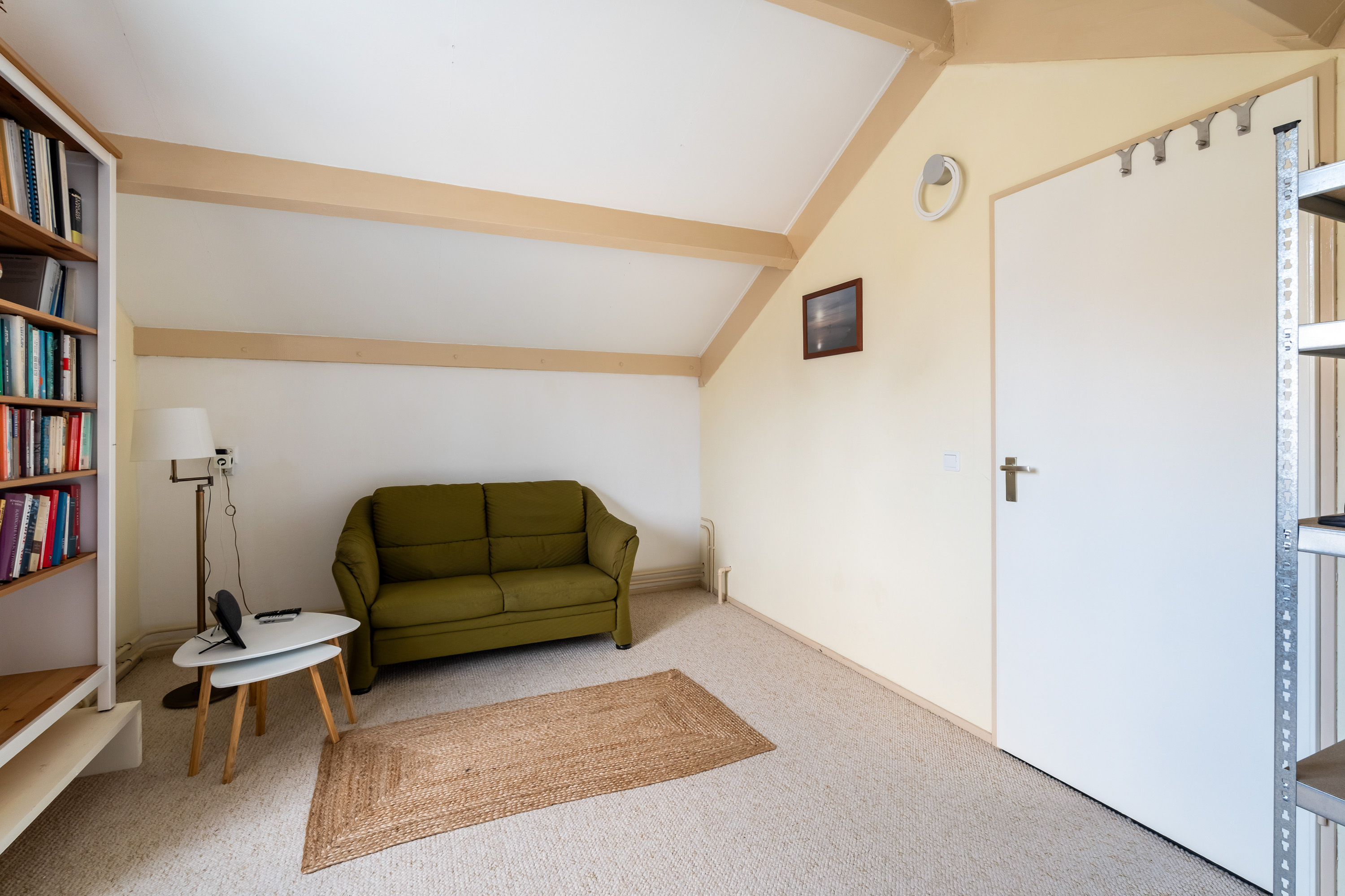 De lekker gelegen woonkamer is licht en geeft direct zicht op en toegang tot de groene en goed onderhouden achtertuin gelegen op het Zuidwesten. De vaste kast biedt ruimte voor opslag. De keuken is eenvoudig en separaat.