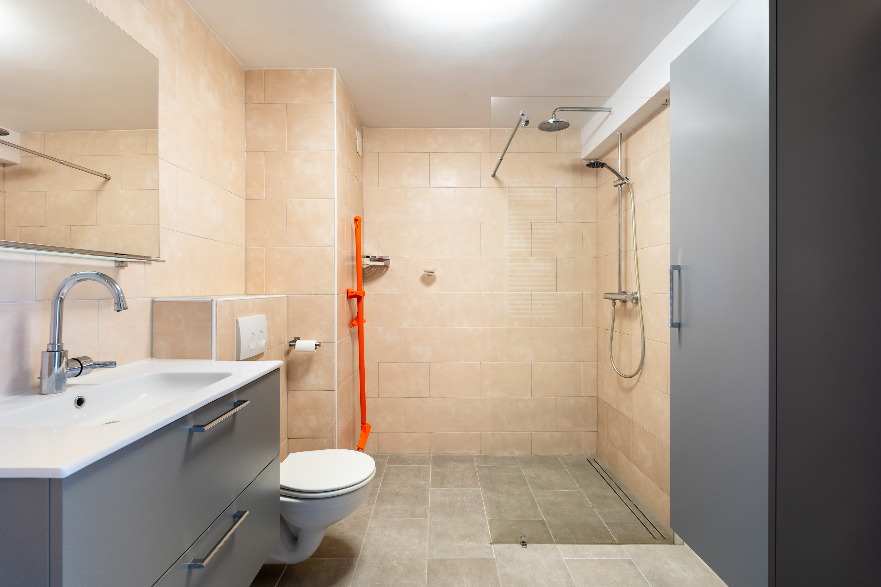 De strakke en moderne badkamer is voorzien van een brede wastafel met badmeubel, toilet en wandkast alsmede een ruime inloopdouche.