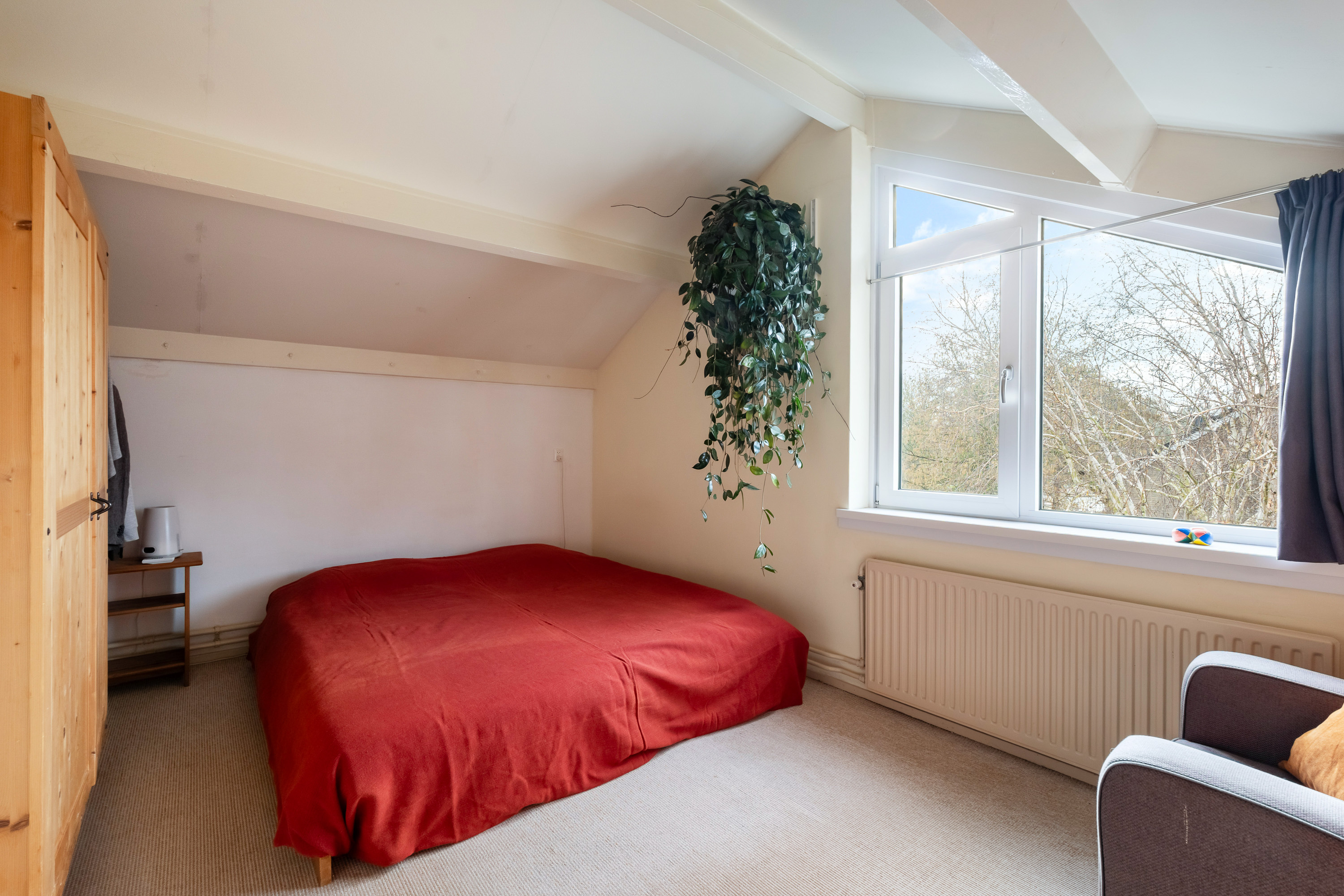 Middels de centrale trap zijn op de eerste etage twee ruime slaapkamers en de 1e badkamer te vinden. De slaapkamer aan de achterzijde biedt tevens toegang tot een eigen balkonnetje en sfeervol zicht op de eigen tuin en groene omgeving.
