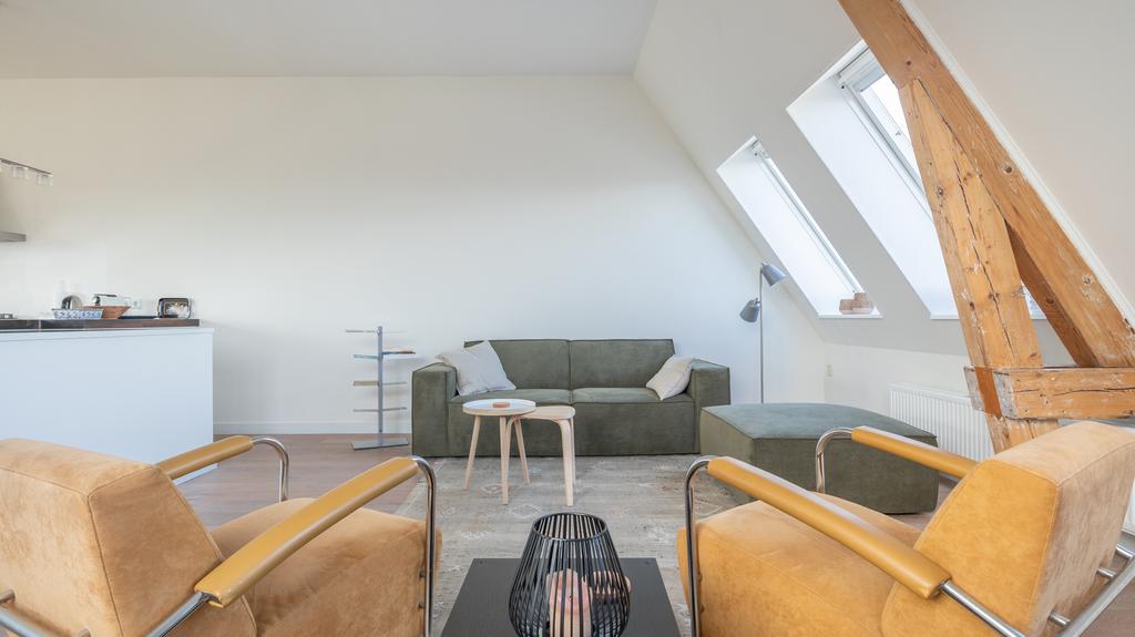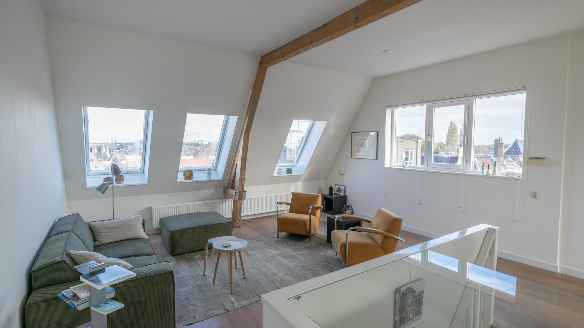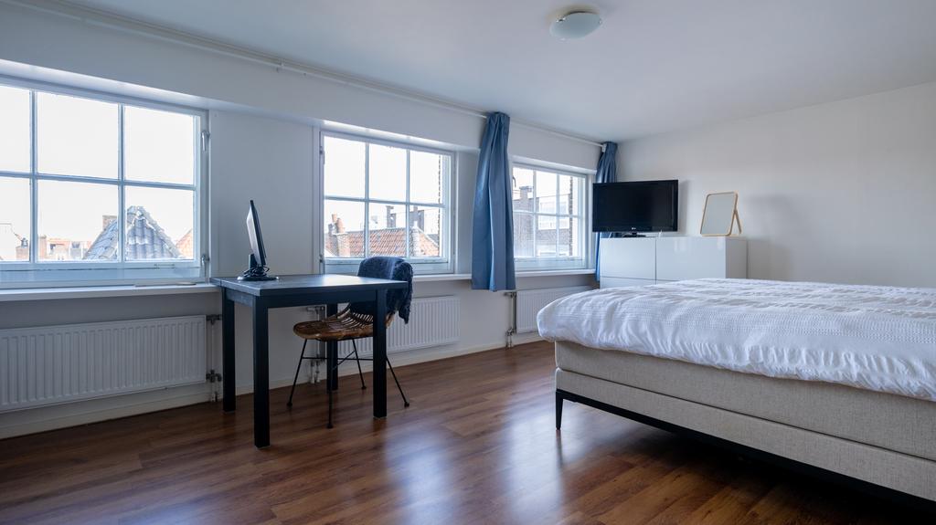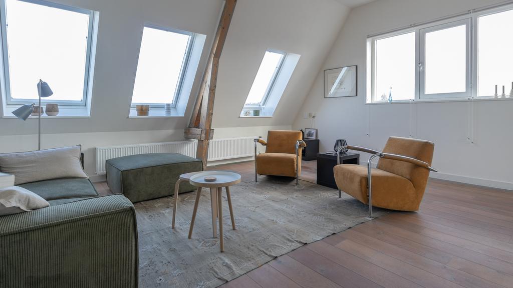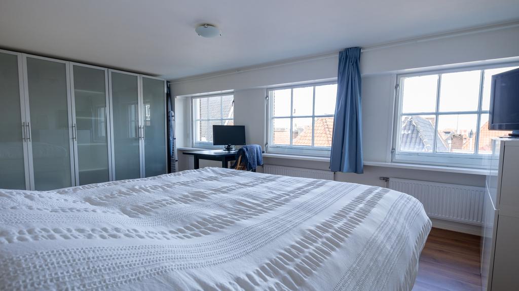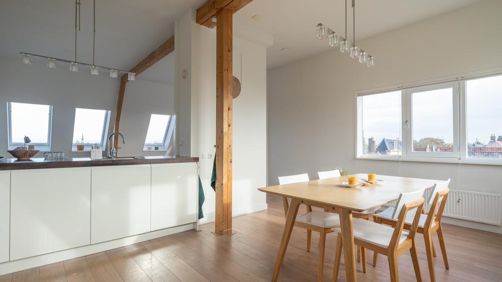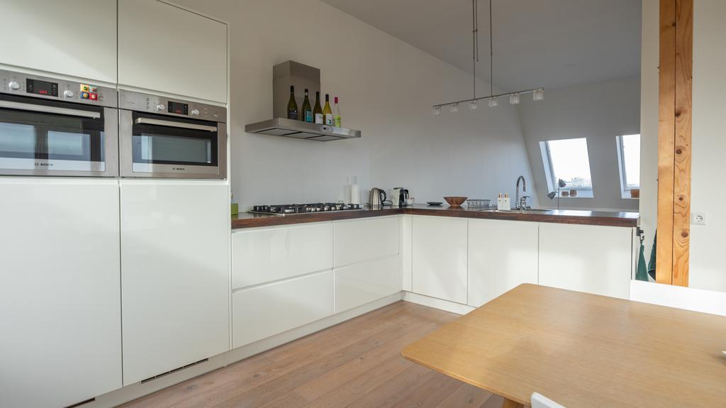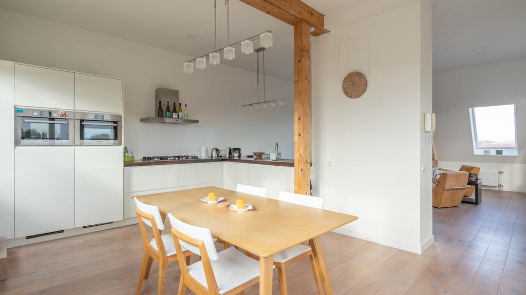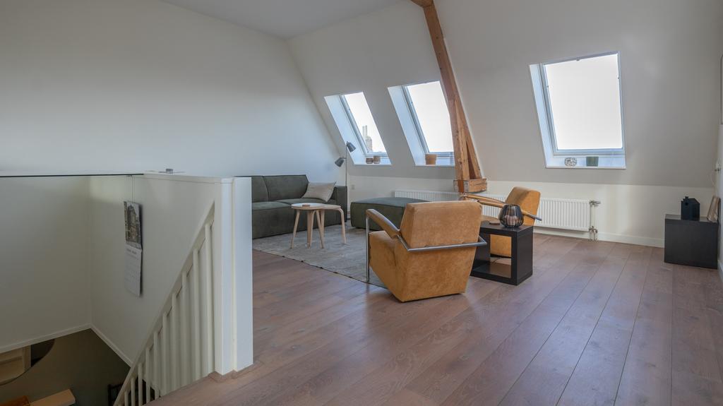 Op toplocatie in historisch Leiden is dit geweldige en volledig gemeubileerde appartement inclusief privé parkeerplaats beschikbaar voor korte periode. Gelegen op de 3e en 4e etage van een zeer goed onderhouden pand is de entree van de woning middels trap of lift te bereiken. Hiervandaan zijn de logeerkamer alsmede de hoofdslaapkamer te vinden. Beiden voorzien van tweepersoonsbed, kledingkasten en meer dan voldoende extra opbergruimte. De grote slaapkamer voorziet naast prachtig zicht op de Leidse daken ook in een werkplek. De badkamer is modern en uitgevoerd met toilet, wastafel en verlichte spiegelkast. Er is een douche en de aansluitende technische ruimte herbergt de separate was- en droogmachine opstelling. De vaste trap komt op de bovenste etage uit in de geweldige “open plan” living en woonkeuken. In bijna alle richtingen is er gedurende alle seizoenen prachtig uitzicht over het historische stadsdeel. De ruimte is met hoog plafond en vele ramen bijzonder licht en toch voelt de ruimte heel comfortabel en praktisch aan. De ruime en moderne keuken is volledig voorzien van alle gemakken waaronder een vaatwasser, inbouw koelkast en separate vriezer, een 5 pits gaskookplaat en zelfs een tweetal ovencombi’s met een magnetron en één met stoomondersteuning. Vanuit de keuken is er toegang tot het unieke, ruime en zeer prettig gelegen dakterras op het Zuiden.